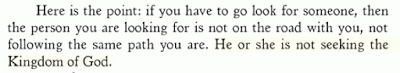 does not appearing to follow the same path i am on really mean that the other is not seeking god? perhaps they are just ahead of me or a smidgen behind. i definitely can be on the same road as another and not see them. sometimes i have waited for them by temporarily stopping or slowing. sometimes i have to catch up. other times i simply miss them. or on some days, i simply don’t note my fellow travelers. i get the gist of what this guy is saying, but dang to come to the conclusion that someone is not seeking god because i don’t happen to notice them on the road. the main text may say it is a narrow path/road but it certainly doesn’t say it’s so short i should be able to see everyone on it. the pattern i see in the main text, is christ swerving and stopping for those the religious say not to on a regular basis. during that error (ha)/ era it really pissed of the people of the church/synagogue. then again perhaps it is not the other not on the path…