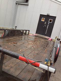 done for the day; spent. tomorrow: bend rebar and mount to ceiling, suspend table components from rebar; yay, dinner with my grand girlfriend. Thursday: suspend/drape rubber over wooden A like structures. Friday morning: finish up. :)16×9′ trailer loaded
