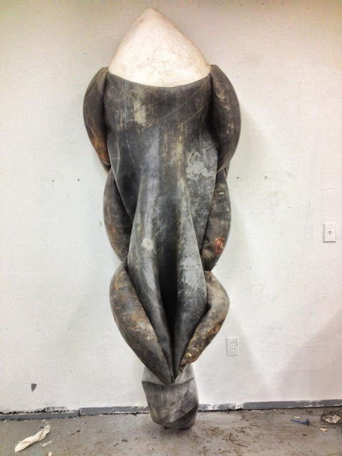 so funny…i am never too far along to not be able to make bad art. i’ve made some this month. so this morning as i walked into the studio, i just started draping a tube from the shelved egg nose blob foam plaster piece…though i don’t care for the eggishness of the white part, i was very pleased with the draping.