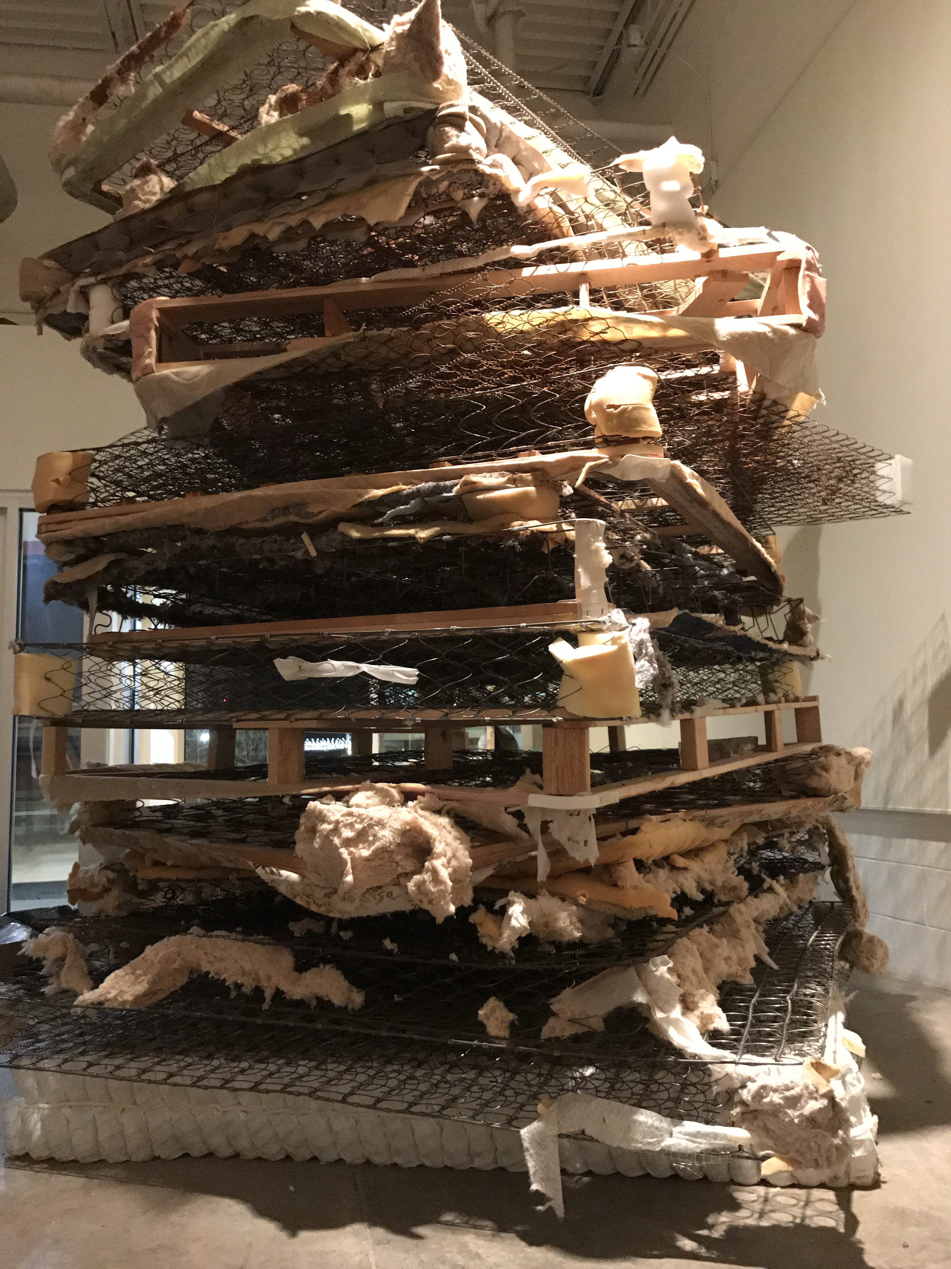 In this initial phase of my Dora project, not yet fully fleshed out, I am compelled by an unexplainable drive to cull from domestic discards as a source material—specifically old mattresses tucked out of sight as refuse lining the back alleyways of Lubbock. In a retrospective rationalizing logic, I ascribe a five fold reasoning to the material selection. First, mattresses are inherently linked with sleep and thus the dream. Second, mattresses bare witness through their human patina stained surfaces the hidden intimacies of dream states and encounters. Third, the mattress is often gendered with various feminine flourishes of detail—floral patterns, quilted substrates and soft pastel coloring. Fourth, symbolically the bed as a privately possessed receptacle for both rest and release from the rigors of the day that culturally link it to the historic position of the female. And finally, the mattress may be skinned to it disparate dermal and sub-dermal material layers as though for biological analysis—steel and wood infrastructure, horsehair, fabric matting, various lattice substrates, raw waste cotton, foams, and quilting—much like the layers of meaning Freud suggests are hidden within the dream’s objects and actions. Yet, this ascribed rational and the descriptive attribution of used mattresses as “source material” for art production are simply guises to make sense of the unbidden compulsion to coat myself in the contaminates of private/public waste as I repeatedly make direct bodily contact with the socially revulsive.